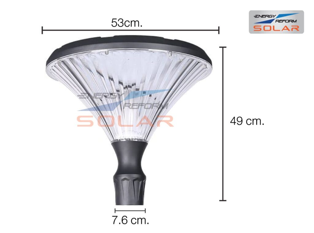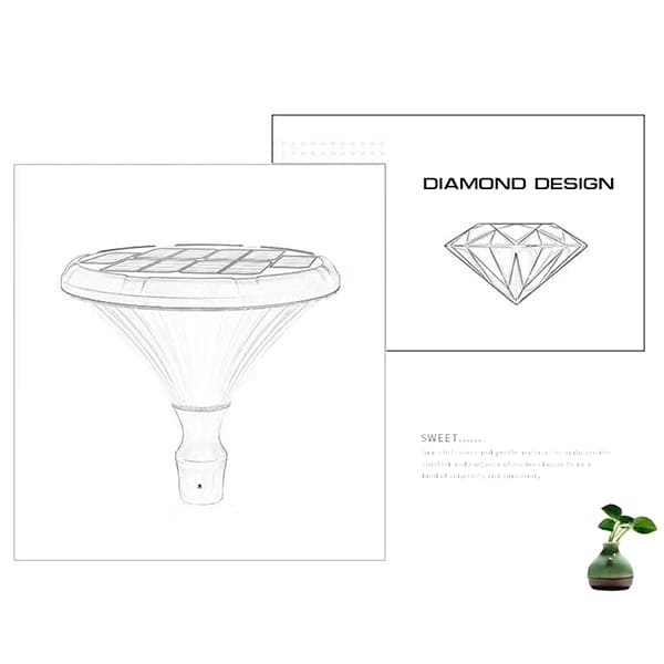 โคมไฟ รุ่น Diamond มาพร้อมกับเสาสูง 3 เมตร ดีไซน์สินค้ามีความทันสมัยสวยงาม เหมาะกับการติดตั้งเป็นไฟสวนหรือถนน ทางเดิน เพื่อส่องสว่าง โดยที่ไม่ต้องเสียค่าไฟ หลอด LED มีแบตเตอรี่ในตัว ชาร์จไฟจากแสงอาทิตย์ ให้แสงสว่างได้นานถึง 12 ชม. (กรณีได้รับแสงแดดอย่างน้อย 5 ชม./วัน) ตัวโคมกันน้ำเกรด IP 65