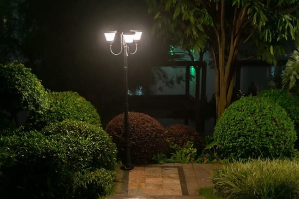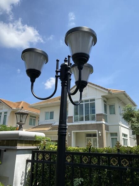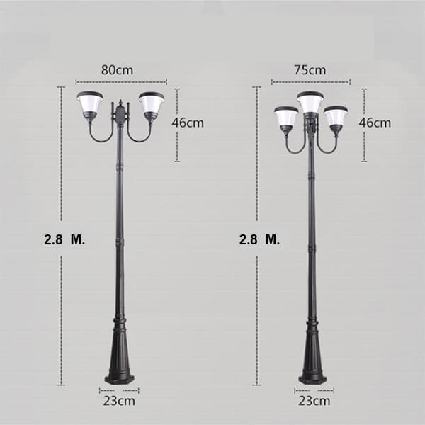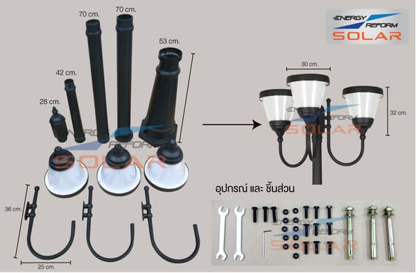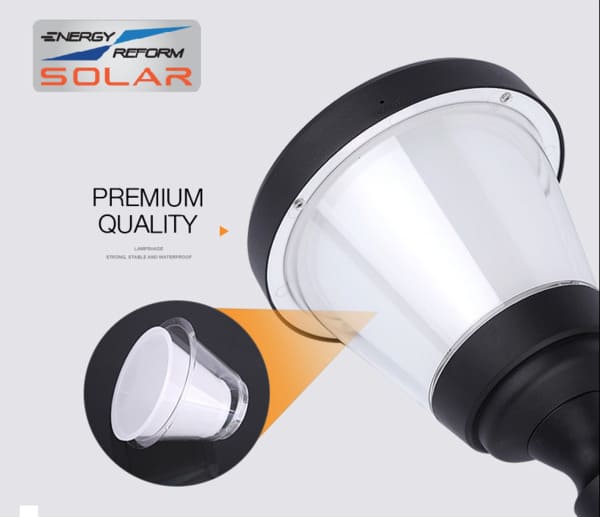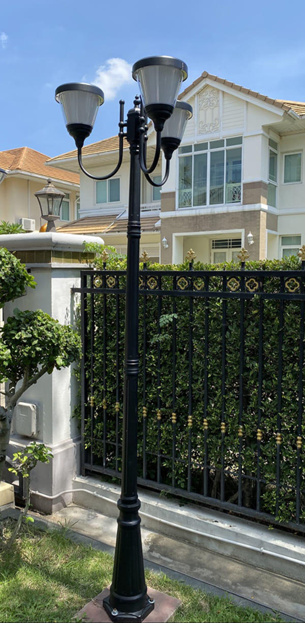 โคมไฟสวน / ถนน ทรงกรวยโปร่งแสง เสาสูง 2.6 ม. โคมไฟสูง 20 ซม. ตัวเสาสามารถถอดประกอบต่อกันได้ 3 ท่อน วัสดุเป็นอลูมิเนียมไม่เกิดสนิท ติดตั้งง่าย น้ำหนักเบา เหมาะสำหรับเป็นไฟถนน สวน หรือ ทางเดินเพื่อเพิ่มความสว่าง โดยไม่ต้องเสียค่าไฟ หลอด LED มีแบตเตอรี่ในตัว ชาร์จไฟจากแสงอาทิตย์ ให้แสงสว่างได้นานถึง 12 ชม. (กรณีได้รับแสงแดดอย่างน้อย 5 ชม./วัน) ตัวโคมกันน้ำเกรด IP 65