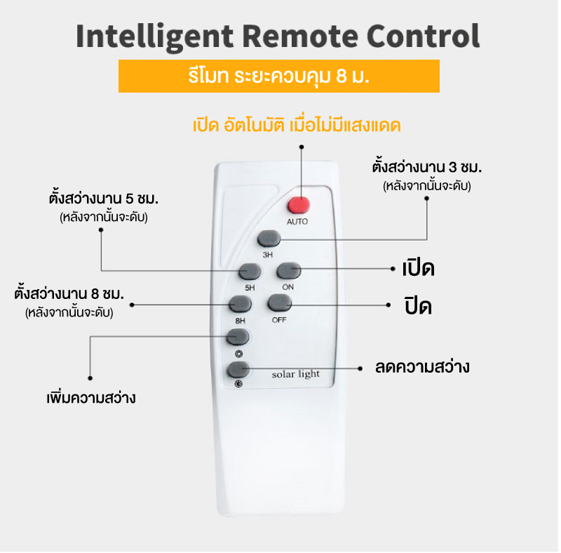 หลอดไฟ LED คุณภาพสูง ชาร์จไฟจากแสงอาทิตย์ พร้อมรีโมท ให้แสงสว่างได้ถึง 10-12 ช.ม. (กรณีได้รับแสงแดดอย่างน้อย 5 ชม./วัน)